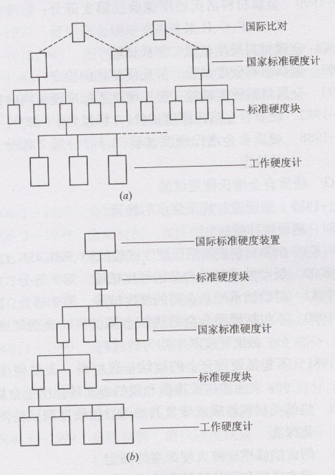 目前硬度計量值的傳遞系統(tǒng)如下圖a所示。國家標(biāo)準(zhǔn)硬度之間依靠互相比對來聯(lián)系。設(shè)想的硬度傳遞系統(tǒng)如下圖b所示,即將來建立國際標(biāo)準(zhǔn)硬度裝置后的情況。