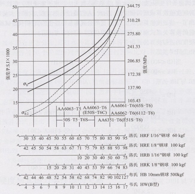 必須說明,與所有已知的硬度-強(qiáng)度換算關(guān)系一樣,該圖表中列出的幾種鋁合金,其硬度與強(qiáng)度的對應(yīng)關(guān)系也是近似的。不過,該圖對于6061、6063等幾種廣泛使用的鋁合金的生產(chǎn)和研制仍有著積極的參考作用。