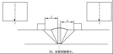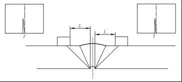 圖C.2所示縱波探頭放在管件焊縫的熔合面上方,橫波探頭放在同一探測(cè)面上與焊縫的熔合面垂直線(xiàn)方向前后移動(dòng),并采用橫方形或縱方形串列掃查,掃查整個(gè)焊縫熔合線(xiàn)。