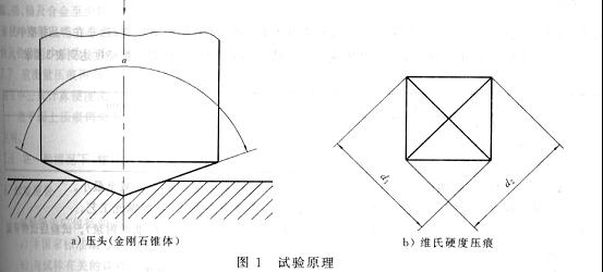 將頂部兩相對面具有規(guī)定角度的正四棱錐體金剛石壓頭用試驗力壓入試樣表面,保持規(guī)定時間后,卸除試驗力,測量試樣表面壓痕對角線長度(見圖1)。