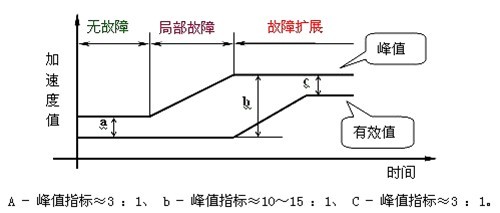 峰值指標(biāo)其定義為:峰值與有效值之比。該參數(shù)適合于滾動(dòng)軸承和齒輪箱的 沖擊類型 故障的早期診斷。設(shè)備無(wú)故障時(shí),該值為3左右;隨故障的出現(xiàn)和發(fā)展,該值逐步增大,可達(dá)到10~15;當(dāng)故障發(fā)展到一定程度,它又逐步變小,并接近于3。具體請(qǐng)?jiān)斠?jiàn)下圖所示。