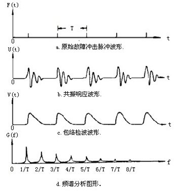 共振解調(diào)是美國(guó)波音公司發(fā)明的一項(xiàng)技術(shù)。當(dāng)設(shè)備發(fā)生故障時(shí)會(huì)產(chǎn)生一組周期性的沖擊脈沖信號(hào),由于這種故障沖擊脈沖信號(hào)的幅值很低,所以在頻譜上很難區(qū)別出來(lái)。但是,這種故障沖擊脈沖信號(hào)的頻帶很寬,它會(huì)與設(shè)備、傳感器或者電諧振器的固有頻率產(chǎn)生高頻共振而形成一組共振響應(yīng)波峰群。換句話說(shuō),它是一種振幅被放大、振蕩衰減時(shí)間被延長(zhǎng)了的高頻自由衰減振蕩波形。這種共振響應(yīng)波峰群,它的最大振幅與故障沖擊脈沖的強(qiáng)度成正比,而振蕩波的頻率也與故障沖擊脈沖信號(hào)的頻率相同。對(duì)此波峰群進(jìn)行包絡(luò)檢波處理,也就是取振蕩波形的包絡(luò)線。這樣可以去除高頻成分和其它的機(jī)械干擾頻率成分,使之成為純低頻的周期波形,詳情見(jiàn)下圖。