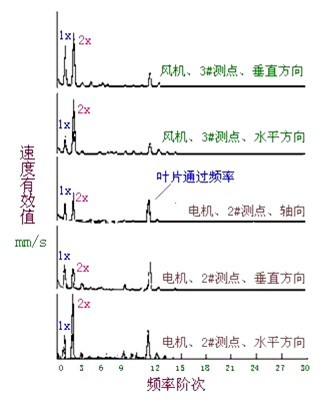 2)振動(dòng)頻率以1×和2×轉(zhuǎn)頻振動(dòng)為主;但往往存在高次諧波振動(dòng);