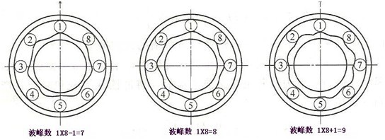 在上圖中,滾動體的數(shù)目z = 8 (個),波紋的數(shù)目N = 1(個)。那么波峰數(shù)就等于:N×z = 8×1 = 8,則8個波峰都同時與8個滾動體相接觸,這樣外滾道就不會產(chǎn)生徑向移動。當波峰數(shù)等于(N×z)±1時,波峰數(shù)= 7或9的情況,可以看見滾動體 ① 和 ⑤ 對稱位置上內(nèi)滾道的波峰不同(① 在波峰而 ⑤ 在波谷)引起。此時在 ① 處由于內(nèi)滾道的波峰將會使外滾道產(chǎn)生如圖中箭頭所指方向的位移,引起了內(nèi)滾道的振動。顯然,外滾道、滾動體都在振動。其振動頻率(即故障特征頻率)如下表所述。