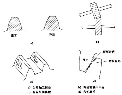 齒輪箱有一些特殊的故障,如節(jié)線偏斜、偏心、齒距誤差、齒面磨損、點(diǎn)蝕和剝落、斷齒等,如下圖所示。造成測(cè)振儀齒輪故障的原因有:制造缺陷、安裝調(diào)整不當(dāng)、過(guò)量磨損、潤(rùn)滑不足、污染、金屬疲勞和超負(fù)荷運(yùn)轉(zhuǎn)等。