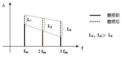 從上圖中可以看到,嚙合頻率各次諧波(2次諧波2fm 、3次諧波3fm)幅值L2、L3的增長(zhǎng)比基頻(fm)幅值L1增長(zhǎng)的還要快,磨損嚴(yán)重時(shí)二次諧波(2fm)的幅值可能超過(guò)嚙合的基頻(fm)幅值。這樣,通過(guò)對(duì)齒輪嚙合頻率的分析,可以了解齒輪表面的受損情況。圖中所示的是:齒輪均勻磨損前后齒輪嚙合頻率及其諧波幅值比較。