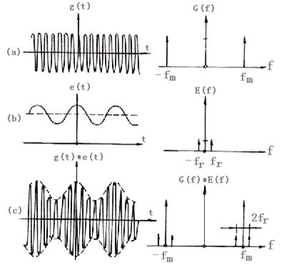 幅值調(diào)制就是一種調(diào)幅波,其中頻率較高的嚙合頻率(fm)稱為載波頻率;頻率較低的稱為調(diào)制頻率(fr),也就是故障信息。其幅值制調(diào)過(guò)程見(jiàn)下圖所示。