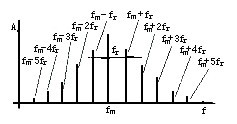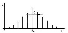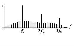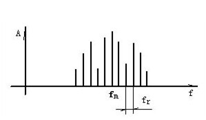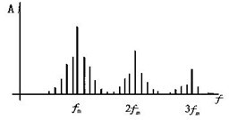然而,由于受系統(tǒng)傳遞特性的影響以及在幅值調(diào)制的同時(shí)還存在著頻率調(diào)制、相位調(diào)制,所以頻譜圖上的邊頻帶分布不會(huì)象上圖所示那樣的規(guī)則和對(duì)稱,大多數(shù)的場(chǎng)合下表現(xiàn)為下圖所示的那種形式。