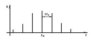 故障信息往往能在調(diào)制頻率上得到反映,分析調(diào)制頻率的分布狀態(tài)對(duì)于齒輪的故障診斷是很有用的。圖中的調(diào)制頻率(fr)對(duì)稱的分布在載波頻率[嚙合頻率(fm)]的兩側(cè),它是載波頻率和調(diào)制頻率的和頻(fm +fr)及差頻(fm-fr),這就是邊頻帶,簡(jiǎn)稱為邊頻。