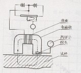 直流矯頑力法的原理如圖所示,在試樣(零件)表面放置電磁鐵,磁化后,電磁鐵與試樣構(gòu)成閉合磁路。在電磁鐵一腳部開一孔,放置高斯計(jì)探頭,在高斯計(jì)上指示磁通大小。測量時(shí),先用飽和電流將試樣磁化到飽和,然后去掉磁場,此時(shí)高斯計(jì)有指示,其指示數(shù)值為剩余磁感應(yīng)。